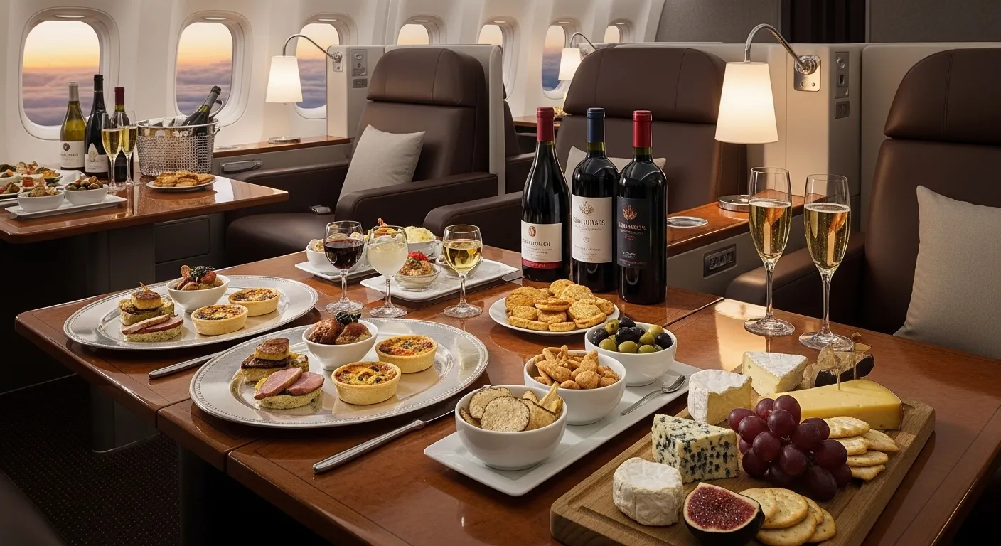 Premium ingredients: Caviar, truffles, rare delicacies, and aged artisan cheeses define first-class presentations. Airlines also offer the finest wines and vintage champagnes, representing the pinnacle of luxury.